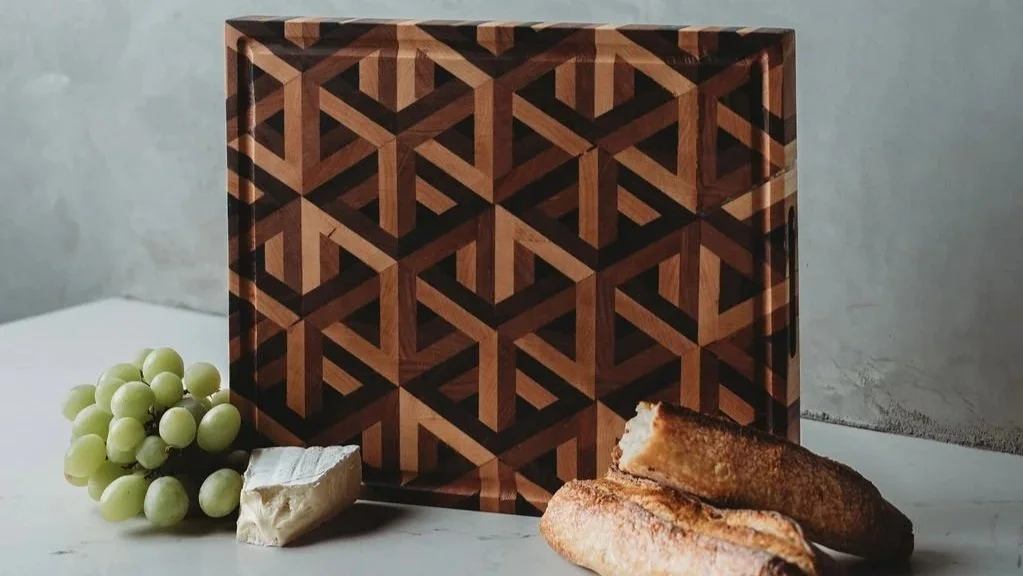 A study in geometry, contrast, and intention, the Tesseract Serving Board transforms traditional end-grain construction into functional art. Each board is composed of carefully arranged hardwood elements that create shifting depth and dimensional movement across the surface, revealing new patterns from every angle.