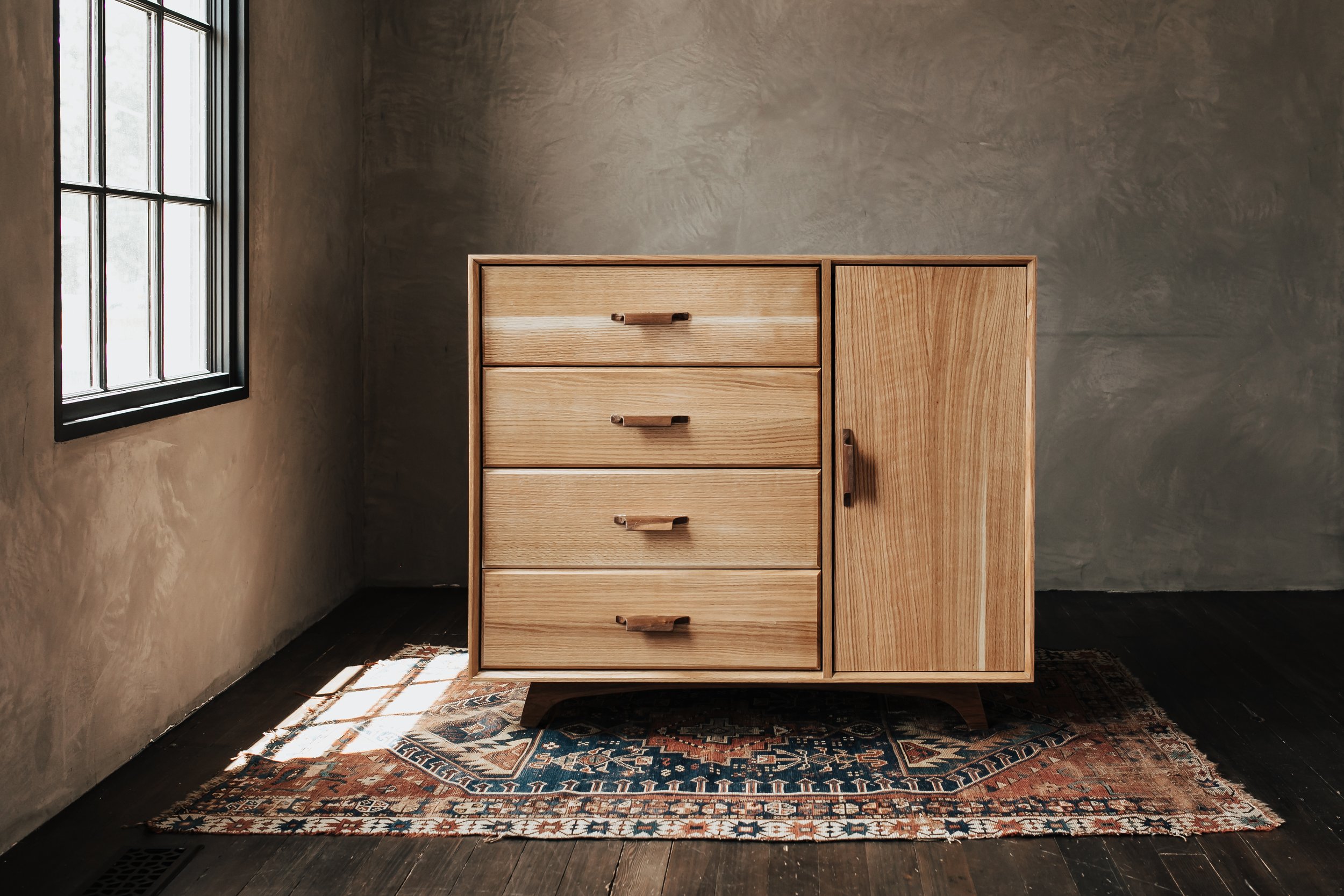 Built from solid red oak with walnut accents, the dresser combines four deep drawers with a dedicated cabinet for bulk storage. The proportions are low and grounded, with gently tapered legs and hand-shaped pulls that echo classic mid-century forms.