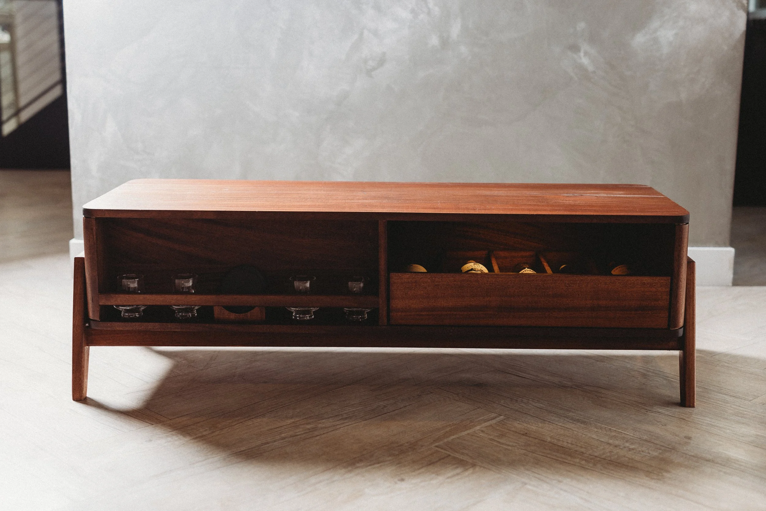 Low, long, and unapologetically smooth, this table was designed as the quiet center of a room where conversations last longer than the ice in the glass. Built from solid mahogany, it balances mid-century proportions with modern function, hiding a full whiskey service behind clean, uninterrupted lines.